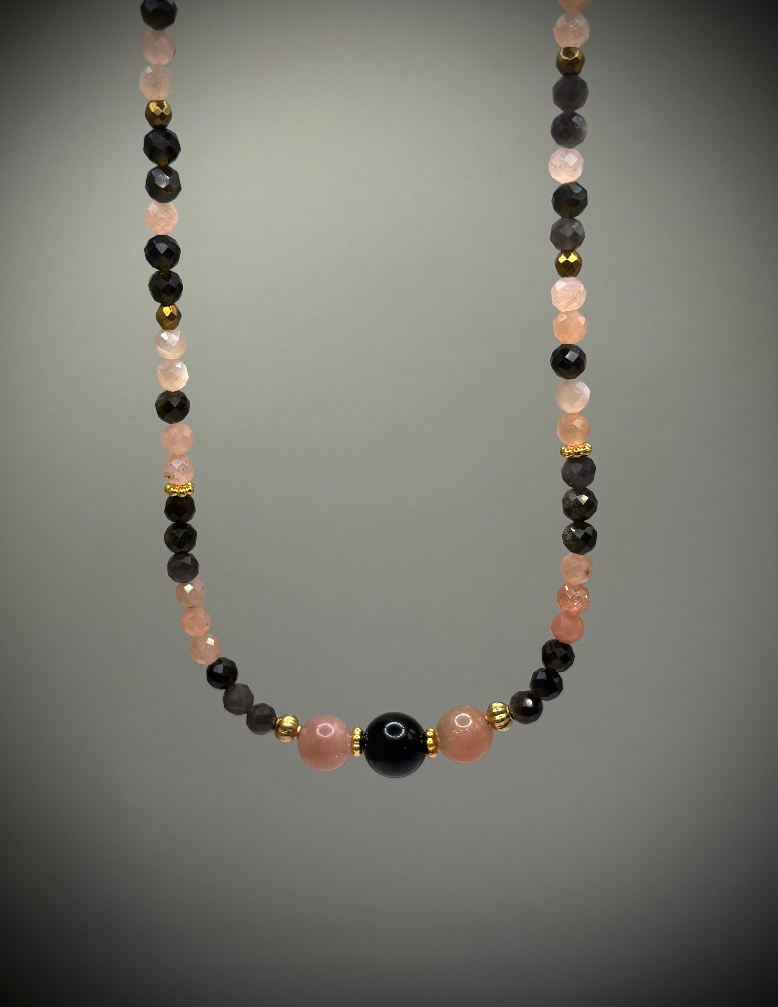 HOA Слънчев камък & Обсидиан: Златна Аура - дамско колие с фасетиран Слънчев камък и златен обсидиан